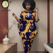 Woman wearing a blue and yellow patterned dress in an indoor setting with 'Afripride' branding.