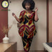 Woman wearing a colorful African print outfit in a room with decor elements.